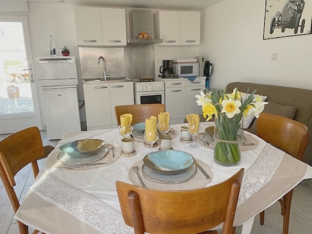 60m2 : une grande pièce à vivre en rez de chaussée présentant un coin cuisine bien équipé et un coin salon avec canapé-lit et 2 chambres à l’étage (1 lit double et 2 lits simples ou grand double au choix et sur demande) – sdb et wc en rez de chaussée